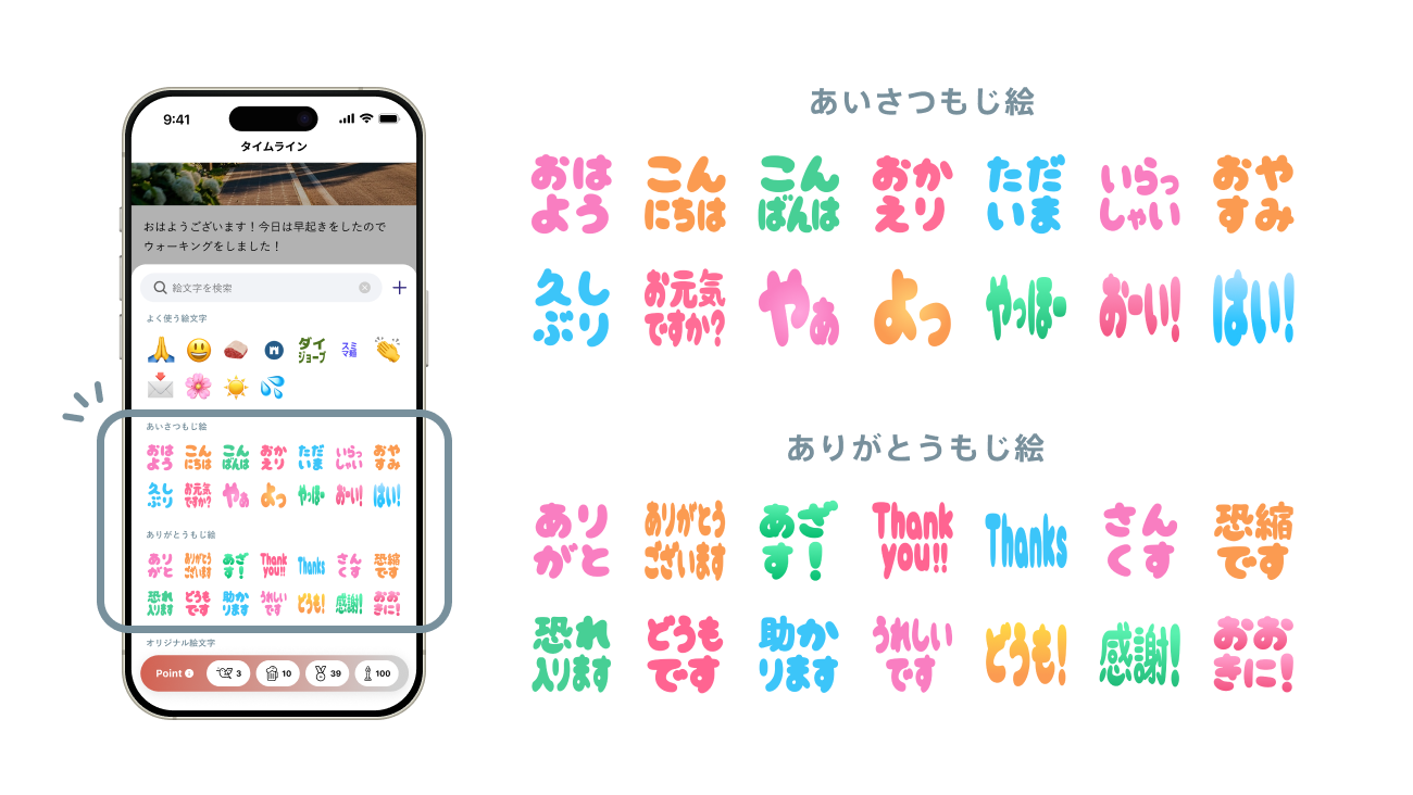 ◼︎感情共有をさらに強化する「ありがとう もじ絵」「あいさつ もじ絵」
