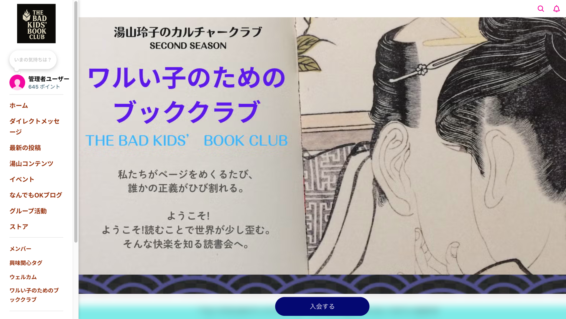 「ワルい子のためのブッククラブ」活動内容 ・月イチ読書会(定期) 湯山さんが選書した本について分析・論考を行った後、メンバーが本に纏わる感想を自由に語る読書会。・ゲストを招いての対談会(不定期) その道の達人、時代の声を持つ人、湯山さんが気になっている人など刺激的な人選によるゲストを招き対談をします。・湯山玲子の夜の実家(店)での小さな食事会(不定期) 湯山さんが行きつけている通称「夜の実家」での小さなご飯会。・人生相談!!!(希望者) 新聞・YouTubeで数々の人生相談をおこない、絶賛大好評の湯山さんによる人生相談。 プロの占い師から、占い師として抜群の星を持っていると太鼓判を押された湯山さんが、その人生経験から「その人が既に心の中で持っている解決法」を引き出していきます。 (※申し込みは別途有料)・独り言ラジオ(不定期) 湯山さんの声日記的なつぶやきを配信。日々、足を運んだコンテンツの帰りの道orタクシーすがらにつぶやくことが多いです。・ 湯山玲子の本棚 この時代を生き抜くために必要な湯山さんの愛読書たちを公開します。 詳細はこちら▼https://yuyamareikocultureclub.com/about