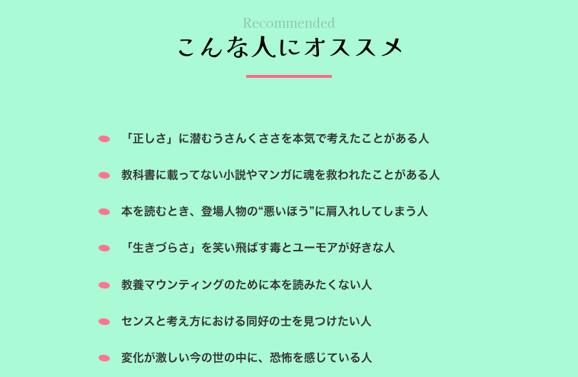 こんな人にオススメ-ワルい子のためのブッククラブ - 湯山玲子のカルチャークラブ - [yuyamareikocultureclub.com].png 89.99 KB 「サイトのトップページにも掲載されていますが、最初に書かれているのはこのブッククラブのコンセプトそのものですね。