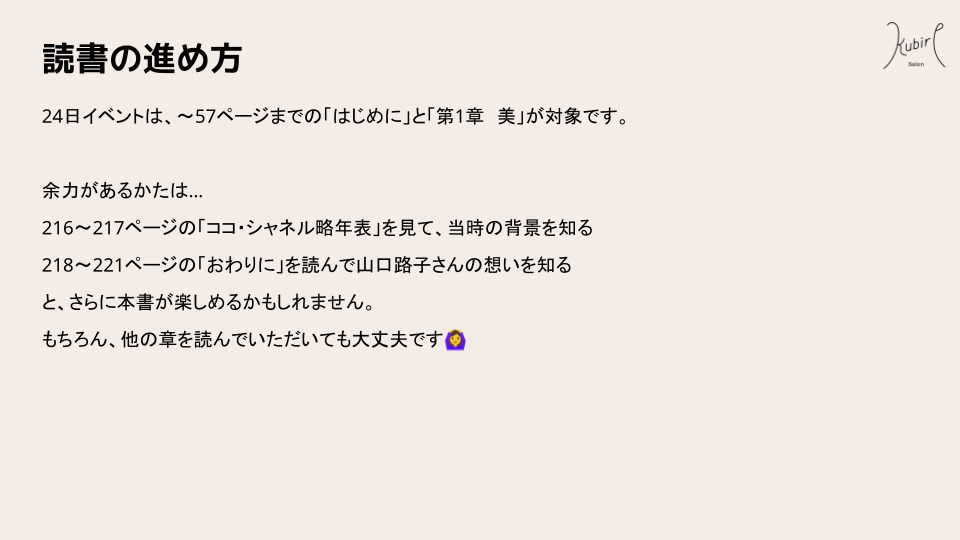 Kubire Salonメンバーの声(抜粋) akaneさん 私は普段から本を読むわけではありませんが、思い立ったら読むので嫌いではないんです。最近はなかなか本を読む時間がなかったのですが、今回のイベントのように課題図書を設定し、同じ本をみんなで読んで感想が言い合えるのはとてもよかった です! 今日は特にかぢちゃん(加治さんの愛称)のお話を聞きながら、隣に座っていたメンバーと「この言葉いいよね!」と感想を話し合っていました。とても楽しい経験でした! ひとみちゃんさん 私は普段エステの仕事をしていて女性と関わることが本当に多く、1対1でコアな関係性を築く必要があります。美容は人生に関わることなので、お話しする機会はとても多いのですが、やはり社会に出てから自分に自信をなくし、性格や内面を隠してしまう女性が多いんです。 けど、自分自身を抑圧してしまうのは、自らを「自分に価値がない」と切り捨ててしまっているようなものです。私は美容を通じて自分自身の気持ちをしっかりと言えるよう、自信を持てるお手伝いがしたいと考えています。 そういった点では、Kubire Salonでの読書の考え方や、今回のイベントで話し合われたことにはとても共感しました 。女性の方は読書が苦手という方も多いので、そういう観点をまず私が言語化して相手の方に伝えていこうと思いました。あおいさん まず、事前読書会があったのはとてもありがたかったです 。今回のシャネルの本は比較的ページ数が少ない本だと思いますが、それでもやはり「読むぞ!」というきっかけがないと、私はなかなか一気に読めないんです。「もうすぐイベントの日が来る。でも、まだ読んでない!どうしようどうしよう...」っていう時に、事前読書会がありオンラインでもそこに集まってみんなで読む。それと、やはり読んだ後に感想を言い合える時間もあり、顔出し不要で声だけで気軽に意見交換ができたのもとても良い体験 でした。 私は「自分の価値観の外側にある価値観」に触れられるところが、読書会のいいところ だと思っています。今回のイベントを通じて、そういう機会をもっと増やしたいと思いました。自分から言えるかは分かりませんが、これをきっかけに自主的に月1回程度で読書会イベントを立てられたらいいなと思っています 。