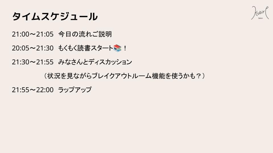 Kubire図書部(Kubire Salonの読書に特化した部活動)のルール ・他の人と比べない ・他の人の意見・思想を否定しない ・自分のインスピレーションのまま話してみる ・今の自分から出てきた言葉を楽しんでみる正解を探さない!恐れない!