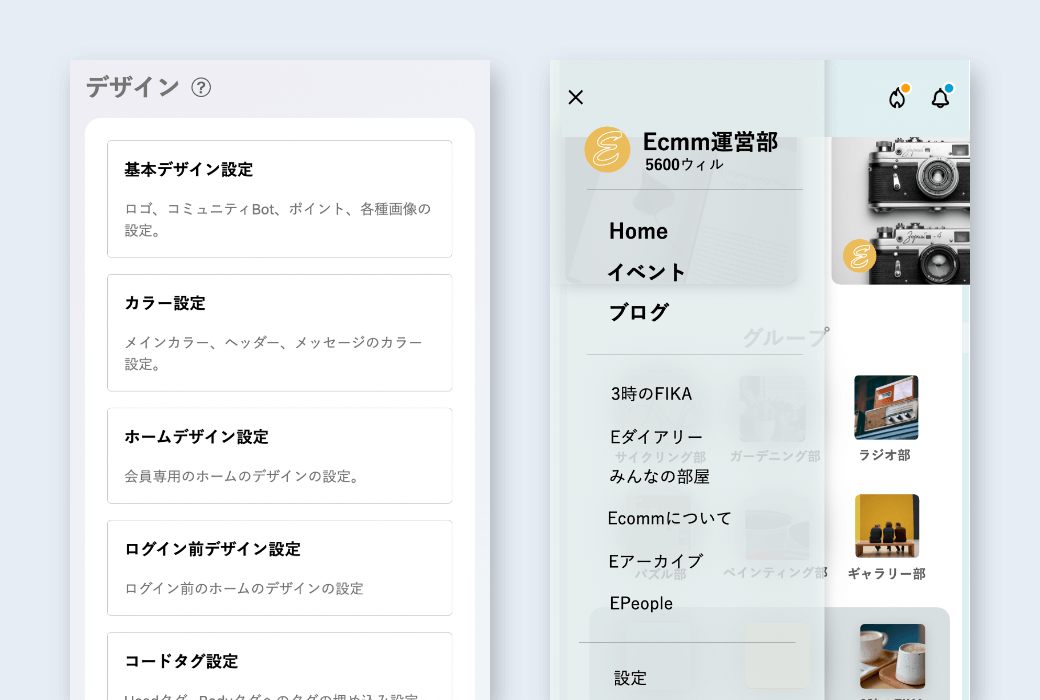 - デザインカスタマイズコミュニティサイトのロゴ、カラー、画像、メインビジュアルの変更が可能です。あなたとメンバーだけの特別な空間を演出できます。