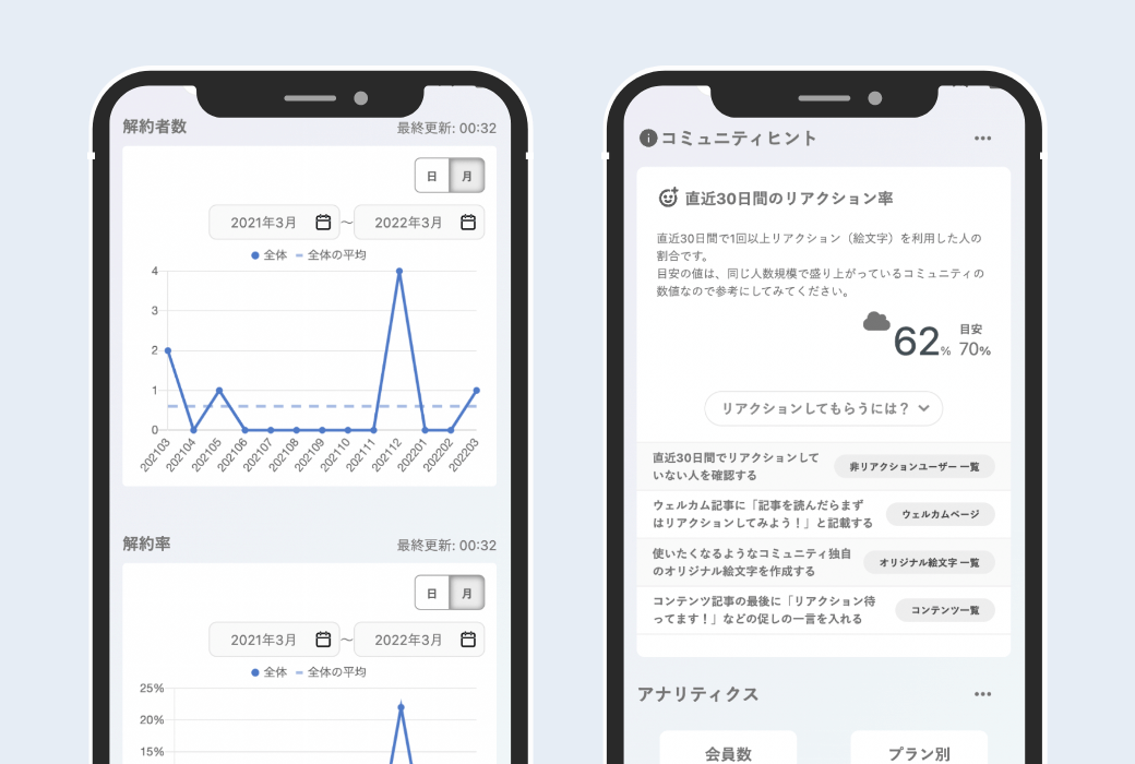 - ダッシュボードコミュニティの盛り上がりを把握できる「熱量分析」から、会員データのCSV出力まで効率的に運営状況を分析できます。