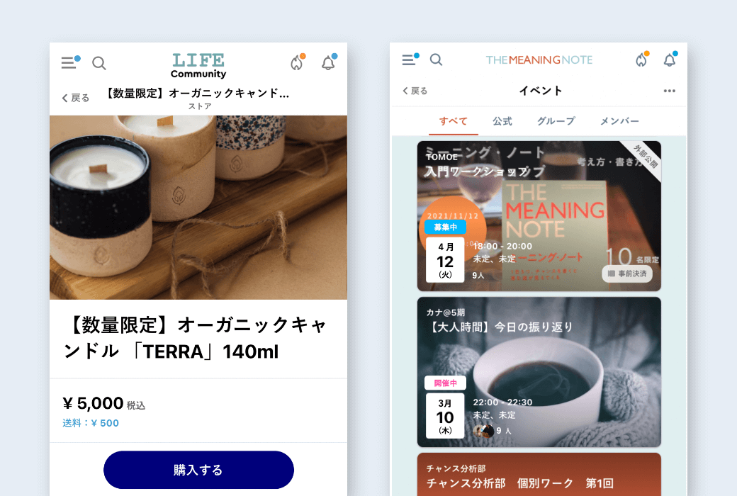 - イベント機能運営者だけでなく、メンバーも自由にイベントを立てることができます。運営者は有料イベントを企画することもでき、用途に合わせた自由度の高い企画を実現できます。