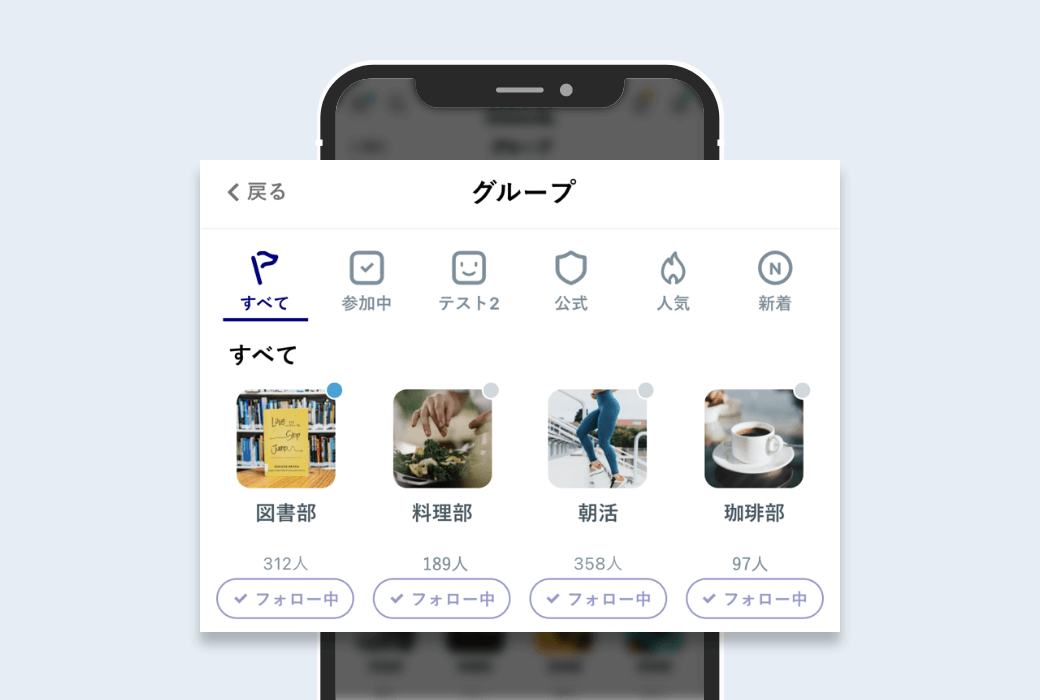 - グループグループ機能を活用し、部活やプロジェクトなど、メンバー主体のグループを作成できます。チャット、記事投稿、イベント機能が内包されたグループはメンバー間の繋がりを強化します。