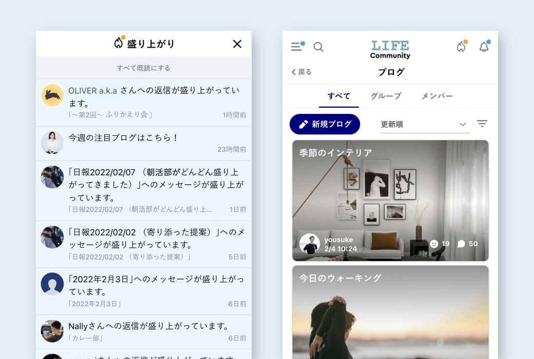 - 盛り上がり通知コミュニティ内の盛り上がりを知らせる通知を受け取ることができます。メンバー間で盛り上がった瞬間を逃すことなく、コミュニティの活性化状態を把握することができます。
