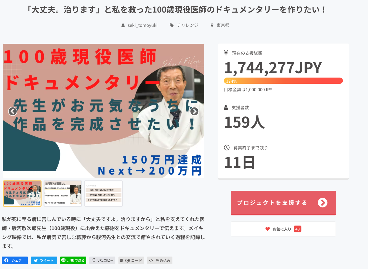 275874554_998878384355525_6300276369528306295_n.png 1.02 MB▲せきともさんの100歳現役医師ドキュメンタリークラウドファンディングの様子ドキュメンタリー作成のヒントとなる作品を教えて貰ったり、企画のブラッシュアップや、クラウドファンディングの文章添削、予告映像の字幕作成など、多くのメンバーに支えられながらドキュメンタリー制作を進めています。