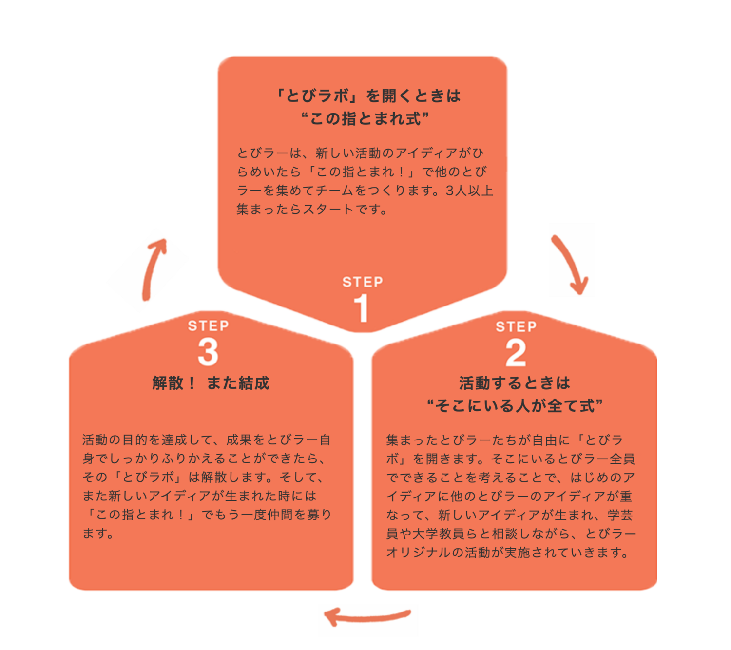02_とびラボ.png 381.85 KB杉山:つまり、「この指とまれ式」は、結成と解散が有機的に繰り返されていく組織運営ということですね。
