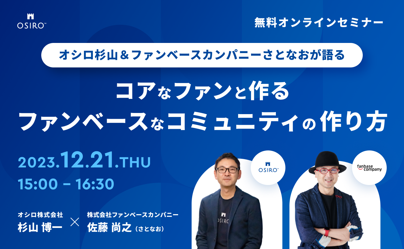 コミュニティ専用オウンドプラットフォーム「OSIRO」を提供するオシロ株式会社(本社:東京都渋谷区、代表取締役社長:杉山 博一、以下 当社)は、2023年12月21日(木)に株式会社ファンベースカンパニー 佐藤 尚之(さとなお)氏をゲストにお迎えしたウェビナーを開催し、アーカイブ動画をオシロ公式YouTubeチャンネルにて公開しました。