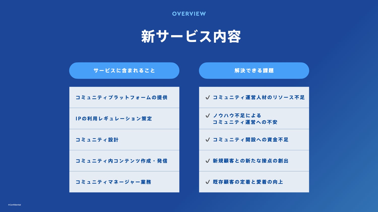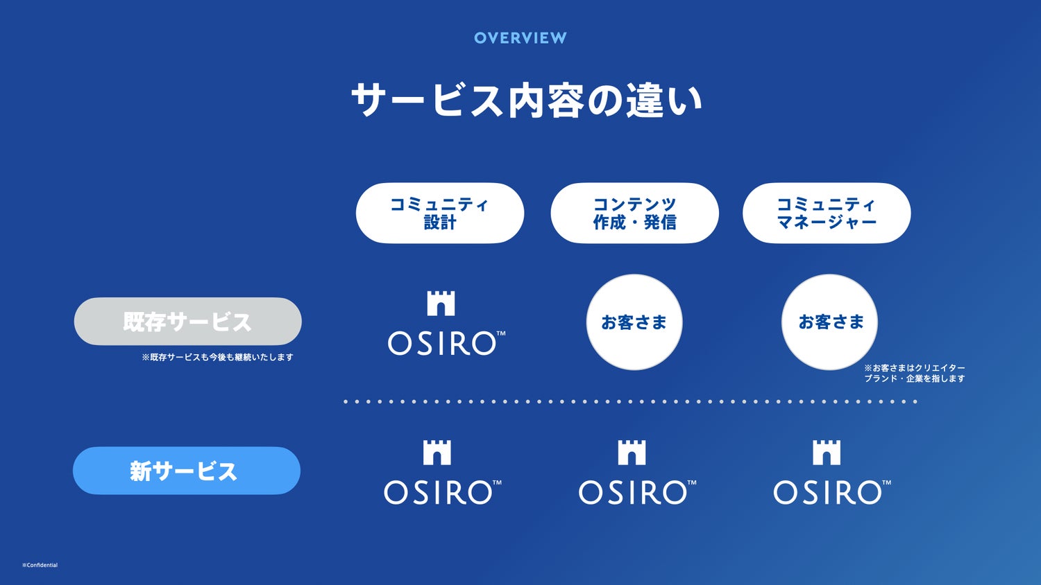 サービス内容_1.jpeg 817.31 KB新サービスは、クリエイターやブランド・企業の担当者さまからIPやコンテンツ・素材の提供をいただくだけでオシロ専任の担当者がクリエイターやブランド・企業の世界観を表現するコミュニティ設計から立ち上げ、運営までを担うワンストップサービスです。従来の「OSIRO」のサービスであるコミュニティ設計、システム提供、オープン後のサポートにとどまらず、包括的な支援によりクリエイターやブランド、企業の豊かなコミュニティをオシロが運営いたします。