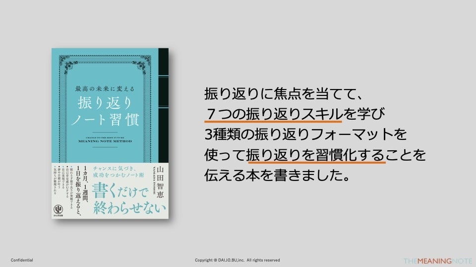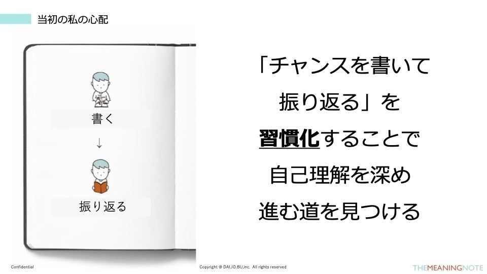 本当に困っていたのは『ミーニング・ノート®︎』の書き方ではなく、振り返りの方法でした。私自身が振り返りを得意としていたので書き方の方に注力していましたが、実は違っていたことを、早いタイミングで教えてもらえたんです。