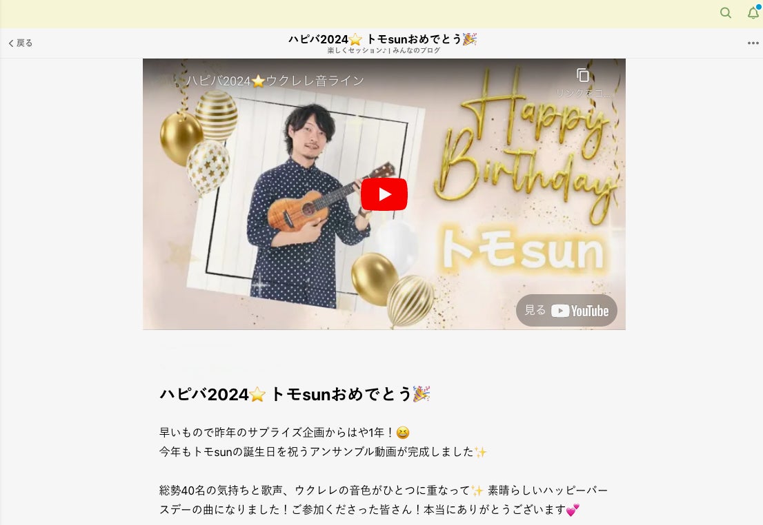 FireShot Capture 116 - ハピバ2024⭐︎トモsunおめでとう🎉 - ウクレレ音ライン - ukulele-online-lesson.com (1).jpeg 366.44 KBウクレレ音ラインのスタートから、トモsunの誕生日にはメンバーによるサプライズ動画がアップされるのが恒例になっている