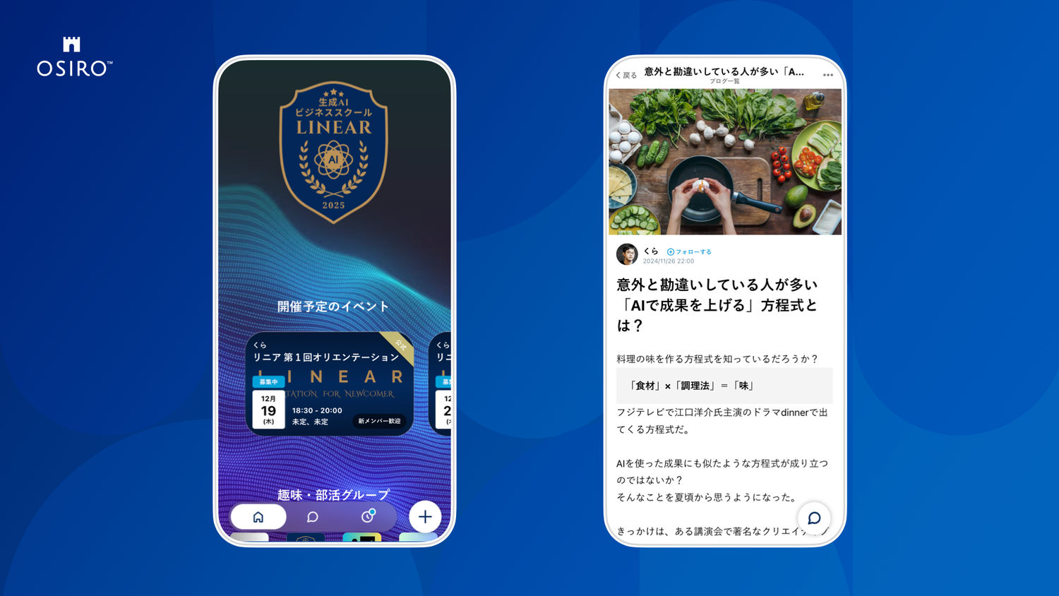コミュニティ専用オウンドプラットフォーム「OSIRO」を提供するオシロ株式会社(本社:東京都渋谷区、代表取締役社長:杉山 博一、以下 当社)は、株式会社Focus on 代表取締役でAI/DXコンサルタント・生成AI研修講師、『AI時代のキャリア生存戦略』著者の倉嶌洋輔さん(以下 倉嶌さん)に「OSIRO」の提供を開始いたします。倉嶌さんはOSIROの導入により、2024年12月11日から生成AIビジネススクールとしてオンラインコミュニティ「Linear(リニア)」をオープン。それに伴い、同日よりコミュニティメンバーの入会募集を開始しました。