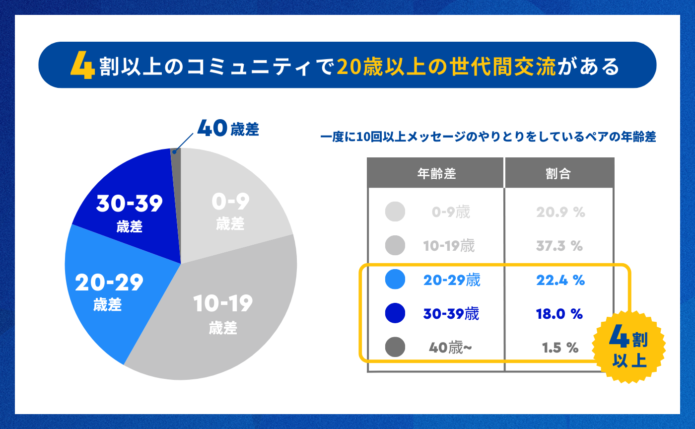・約4割のコミュニティにおいて「一度に10回以上相互メッセージを交わした年齢差20歳以上のペア」が存在する。