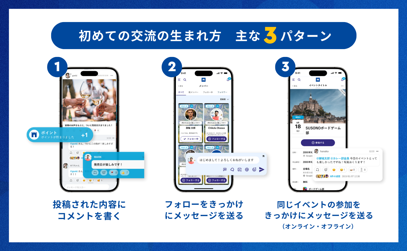 ・初めての交流の生まれ方は、投稿へのコメント、フォロー起点のメッセージ、同じイベントへの参加の大きく3パターン。