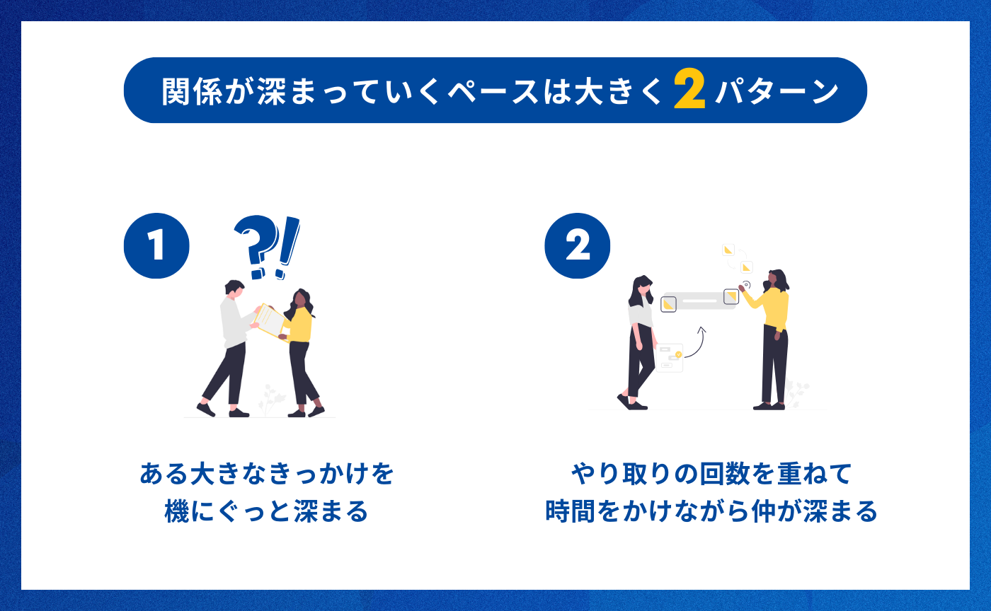 ・仲が深くなるペースは、共感や共有など大きなきっかけを機にぐっと深まる、もしくは、やり取りの回数を重ねて徐々に深めるの大きく2パターン。