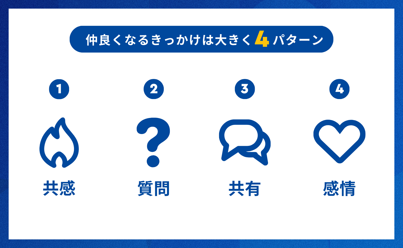 ・仲良くなるきっかけは、共感・質問・共有・ポジティブな感情の大きく4パターン。