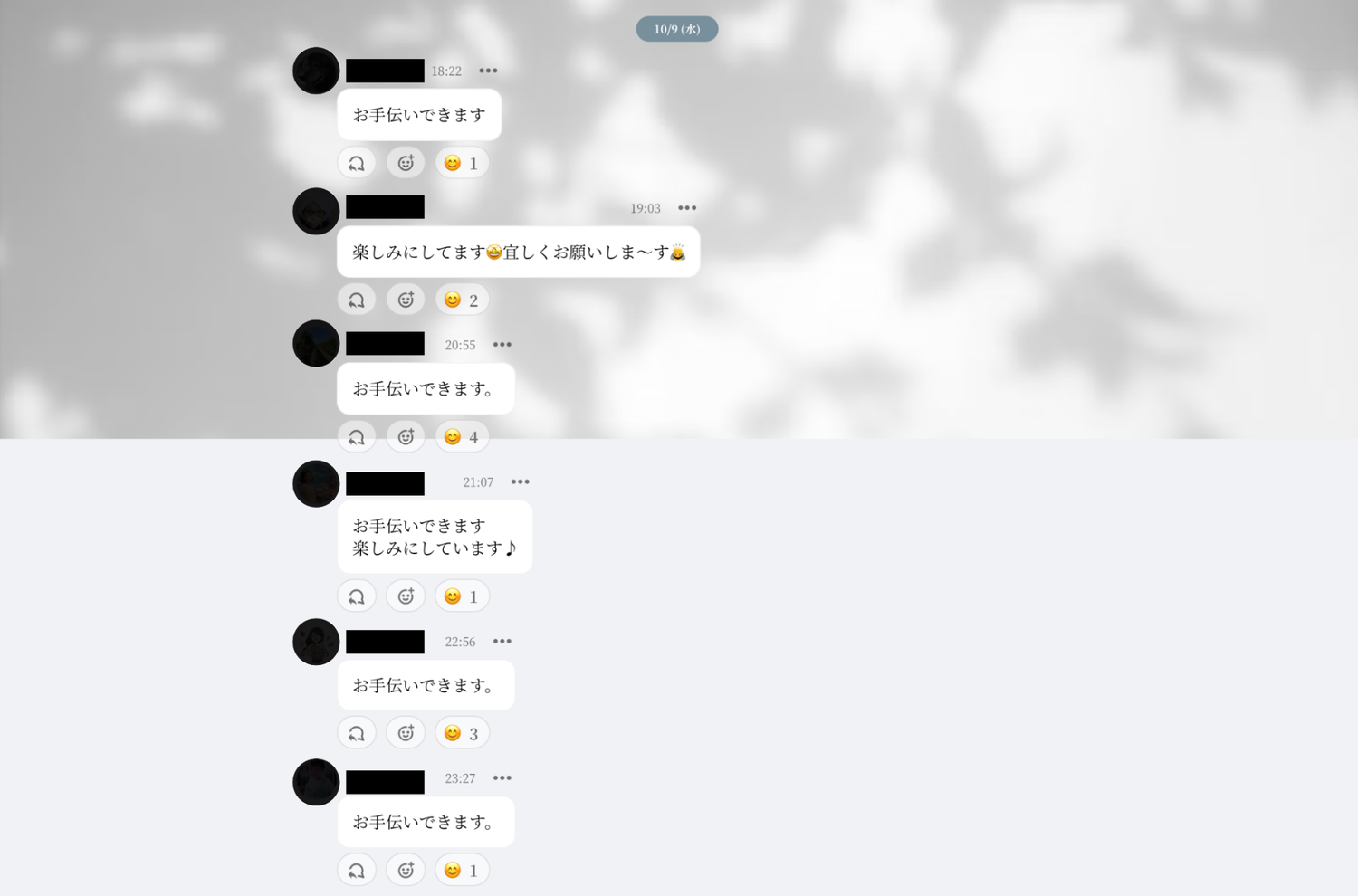 お手伝いを名乗り出てくれたメンバーの中に、普段はあまり発信や交流をされない方もいたんです。そんな方が、お手伝いの募集にはすぐに手伝えることを表明してくださいました。