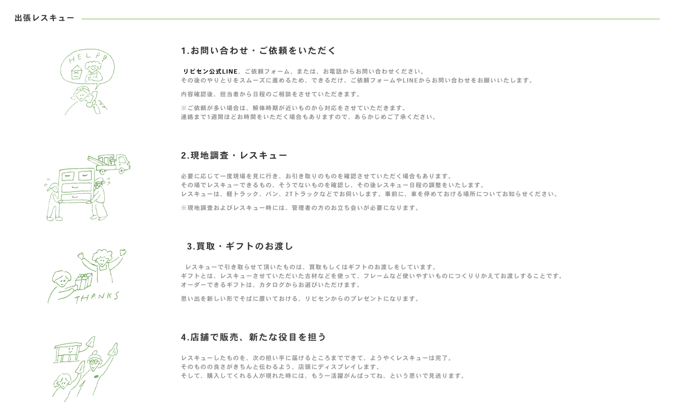 Rescue – ReBuilding Center JAPAN - [rebuildingcenter.jp].png 253.69 KB リビセンがレスキューを行うプロセス 。レスキューした古材・古道具は買取のほか、回収した古材や古道具を活用したギフトをリビセンが製作し、依頼主にプレゼントすることもある(画像提供:ReBuilding Center JAPAN) 軸となるのが、解体が決まった建物から古材や古道具を引き取る「レスキュー」。