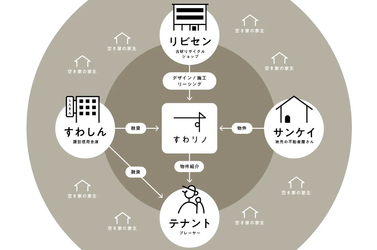 s-2400x1594_v-frms_webp_d7e63bec-6820-4145-89d1-943faf40812f_middle.jpeg 179.15 KB すわエリアリノベーション社の事業スキーム(提供:すわエリアリノベーション社) 「レスキューをしていると、古物の情報と空き家の情報がセットでやってくるんですね。 古材や古道具は今まで通りリビセンで販売していますが、空き家の情報が入った際に解体ではなく売ったり貸したりしたいという話もあります。そうしたニーズには諏訪に住んだり諏訪に根ざしたビジネスをしたいと考えている人にマッチングする。そんな仕組みがあればエリアリノベーションを活性化できると思ったんです。