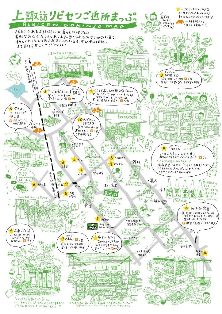 0adb44bbf49652de66166ac71eb366ce-724x1024.jpg 237.04 KB 諏訪圏域のおすすめのお店やリビセンがデザインした店舗を紹介する「上諏訪リビセンご近所まっぷ」。イラストはイラストレーターの山本ひかるさんが担当。(画像提供:ReBuilding Center JAPAN)