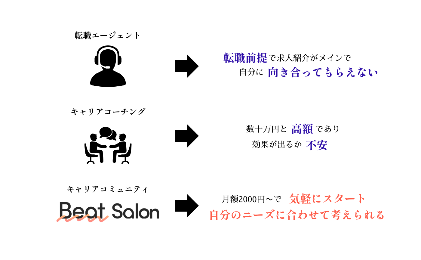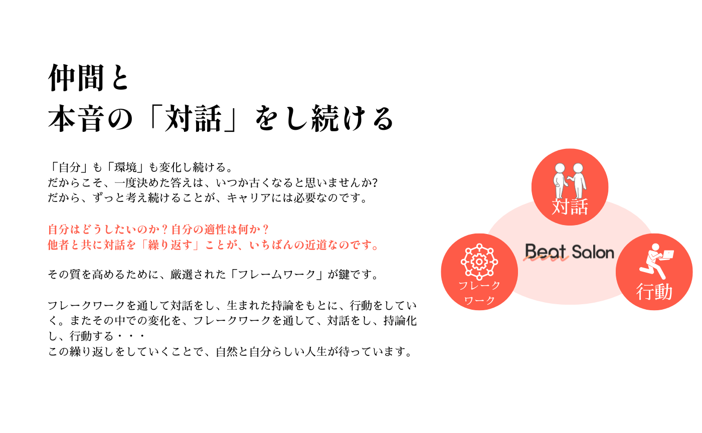「キャリアコミュニティ Beat Salon」は第3の選択肢として、対話×フレームワーク×行動で、自分を生かすキャリアを創れる場所です。