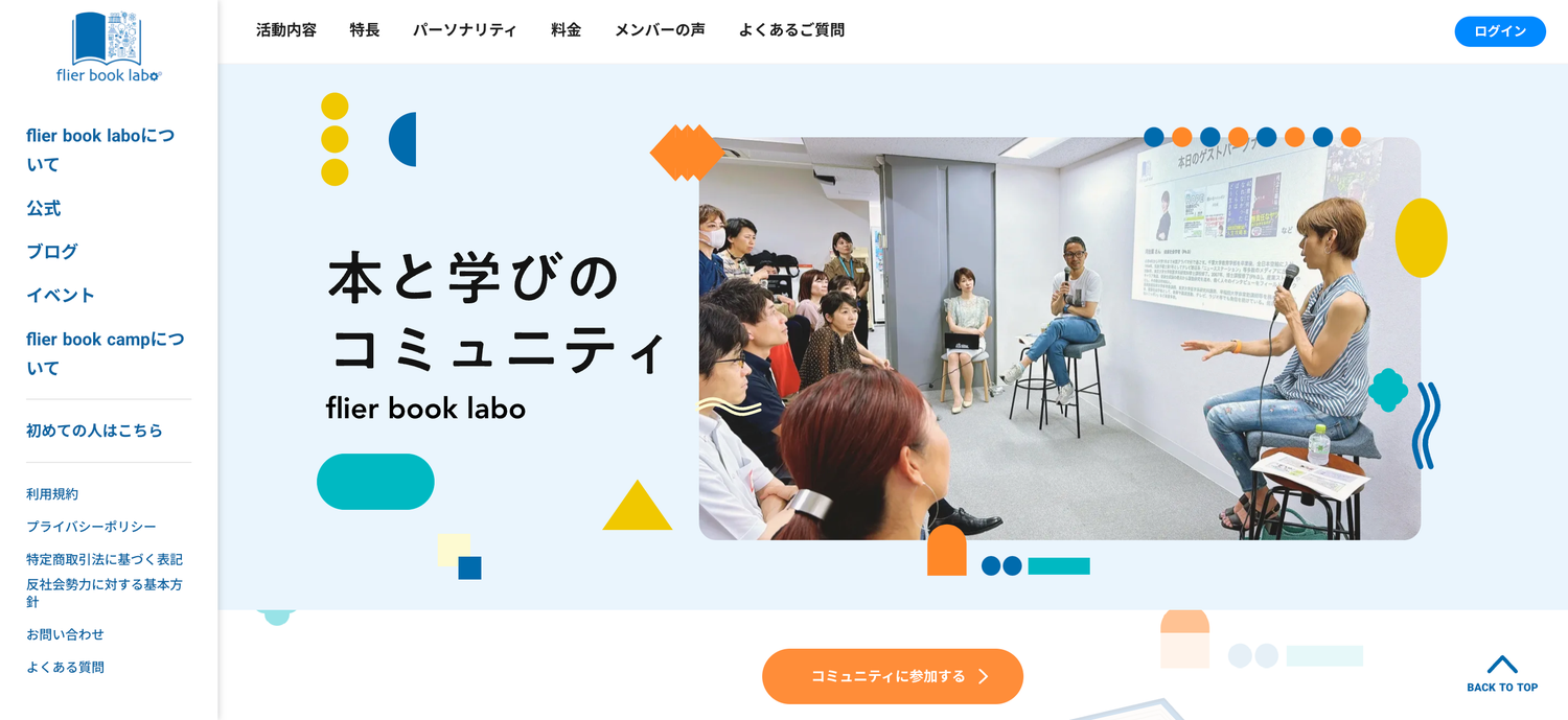 flier book labo flier book laboは、本からの気づきや、コミュニティメンバーとの交流、著者との実践講座を通して、学びを育てるオンラインコミュニティ。オンライン9割、リアル1割。いつでもどこでも気軽に参加できるようオンラインでの活動がベースとし、リアルでの交流会も開催される。読書会をはじめ、メンバー同士や著者と交流できるさまざまなアクティビティが用意されており、毎月新規メンバーを受け入れるオンボーディングミーティングを開催しているため、コミュニティに慣れるまでのサポートも充実している。 flier book labo コミュニティサイト