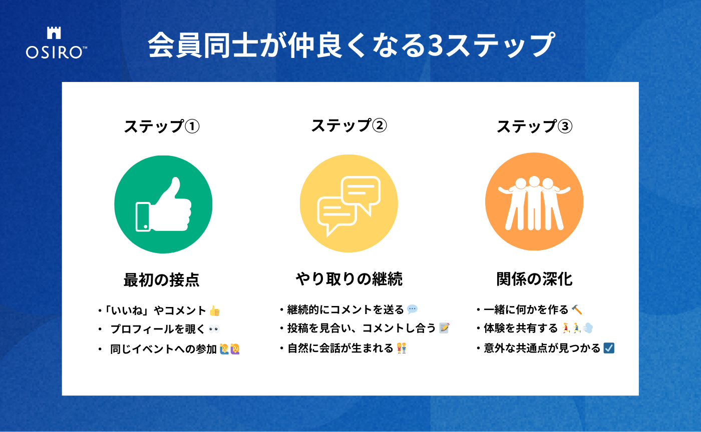 「最初の接点 → やり取りの継続 → 関係の深化」の3ステップは、会員同士のつながりが自然に生まれていく基本の流れです。 このプロセスを意識しながら、会員同士の交流が自然に生まれやすい導線や、関係性の構築を促進する場 を丁寧に設計することで、メンバー同士の関係性は少しずつ深まり、やがて“ここにいたい”と思えるあたたかな場所へと育っていきます。 本記事ではオンラインコミュニティで交流が生まれるプロセスについて解説しました。一方で、気になるのは「具体的にどのような工夫をすれば会員同士の交流が生まれやすくなるのか 」だと思います。 以下の関連記事では、OSIROでオンラインコミュニティを運営する方々が実際にやっている「交流を促す工夫」について紹介しています。こちらもぜひご覧ください。
