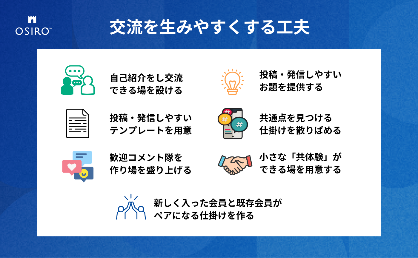 OSIROはコミュニティをただ“作る”ためのプラットフォームではなく、「会員同士の交流を生み出すコミュニティ設計」もサポートしています。