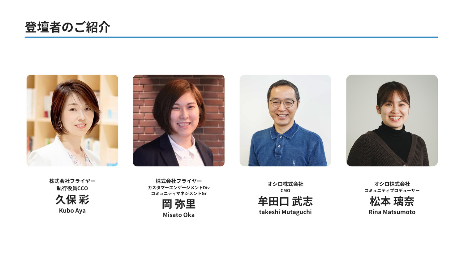 コミュニティ専用オウンドプラットフォーム「OSIRO」を提供するオシロ株式会社(本社:東京都渋谷区、代表取締役社長:杉山 博一、以下 当社)は本の要約サービス「flier(フライヤー)」を展開する株式会社フライヤーが運営するオンラインコミュニティ「flier book labo」の担当者のお二人をお迎えし無料オンラインウェビナーを開催。今回のウェビナーでは、“事業に貢献するコミュニティの作り方”をテーマに、「プロダクトやサービス提供者がコミュニティを立ち上げ、運営する意義」や「ビジネスの成長と新規事業創出におけるコミュニティ活用」における実践的な知見についてお話を伺います。