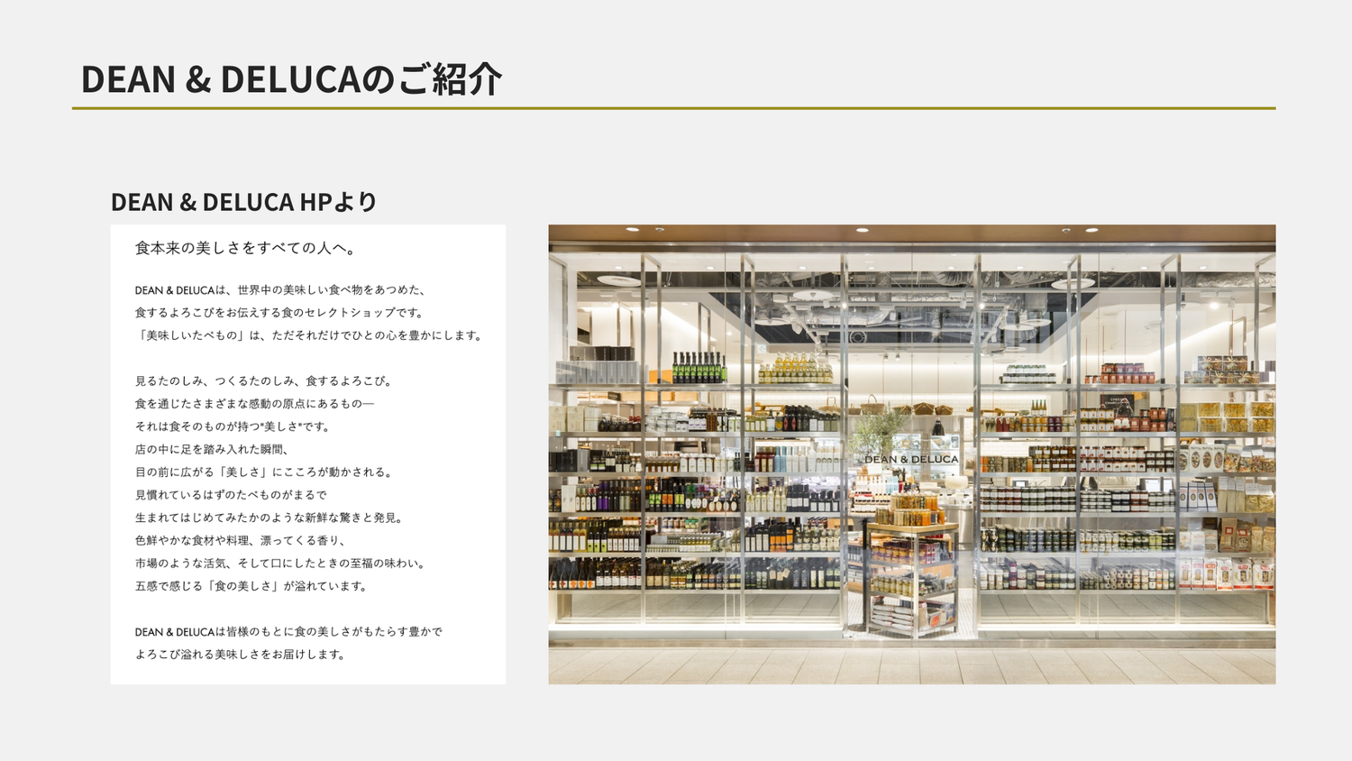 例えば、皆さまが『DEAN & DELUCA』と聞いて思い浮かべるのは、トートバックや季節限定のドリンク、またはマフィンなどの人気商品をご想像いただくと思います。そのようなご認知をいただいていることも非常にありがたいのですが、