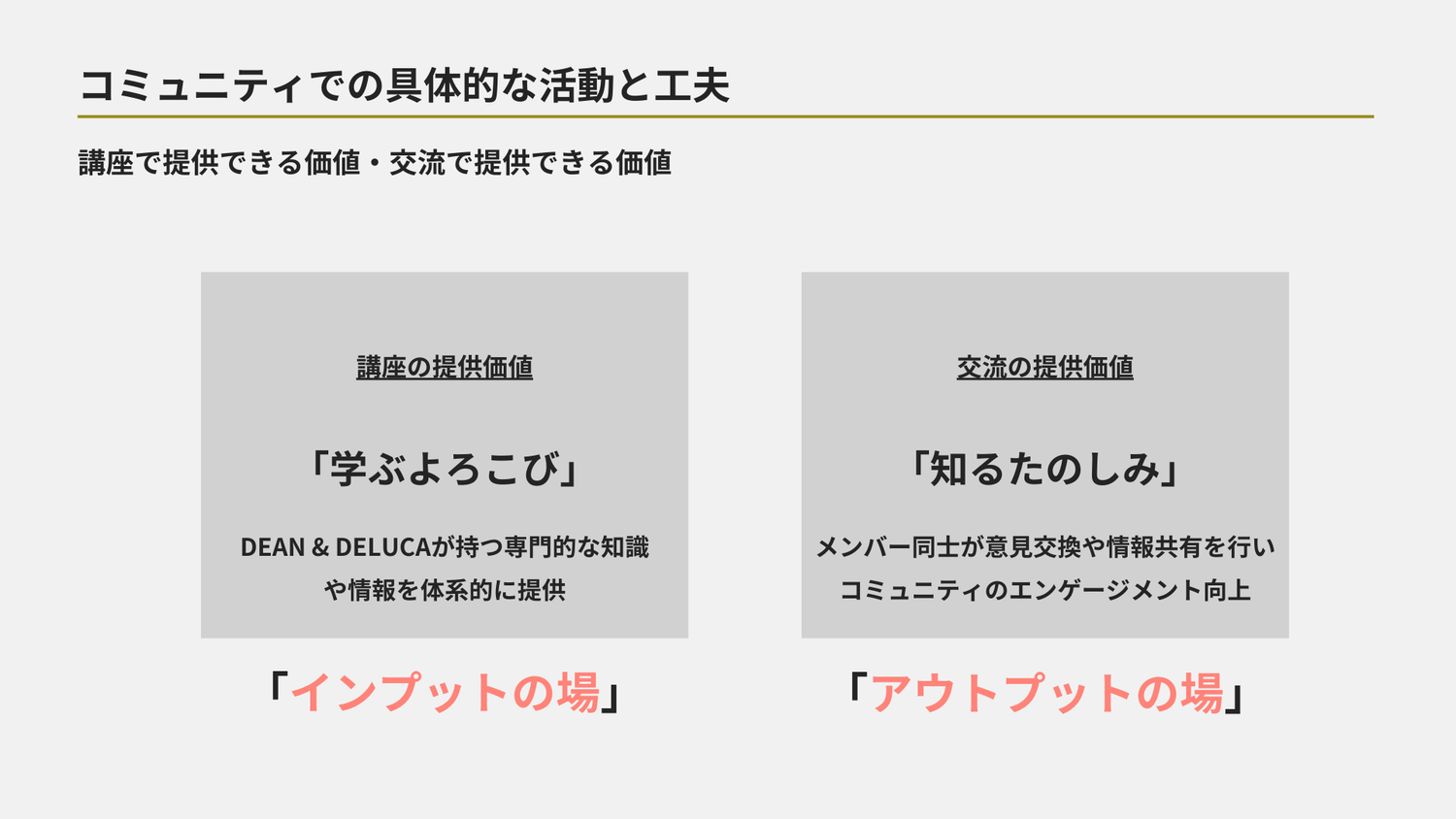 具体的には、DEAN & DELUCAのバイヤーやシェフ、それからソムリエといったプロによるオンラインの講座であったり、コミュニティメンバー限定の体験イベント、生産者をゲストに招いての特別イベントを開催。このような体験を通じて、コミュニティの中でのメンバー同士の活発な情報交換や交流が生まれています。