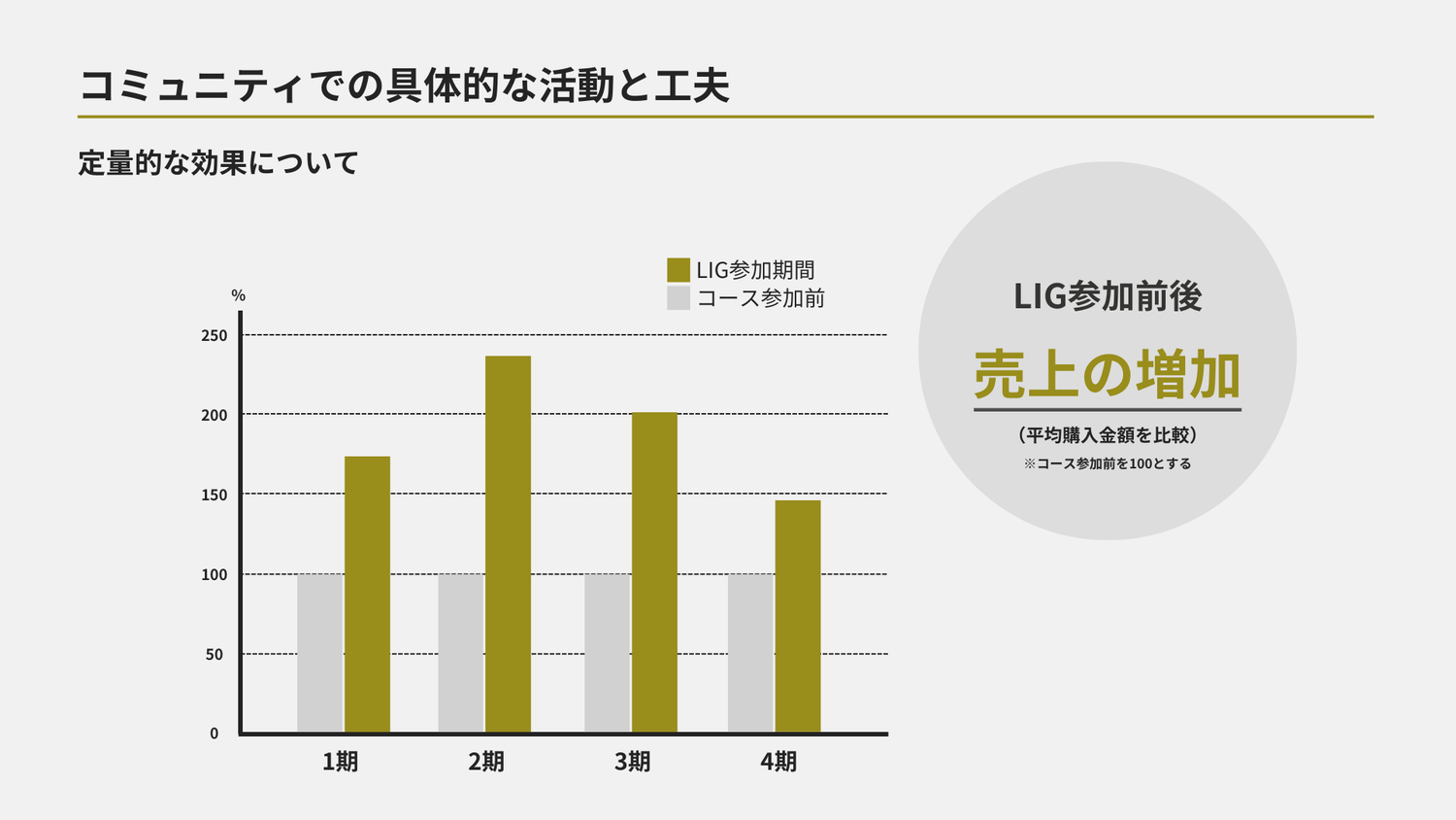 23.png 80.74 KBLIGの定量的な効果。コミュニティに参加した方々の平均購入金額は参加前後で増加している「定量的な面では、コミュニティに参加していただくことでDEAN & DELUCAとの接点がぐっと増え、それによって