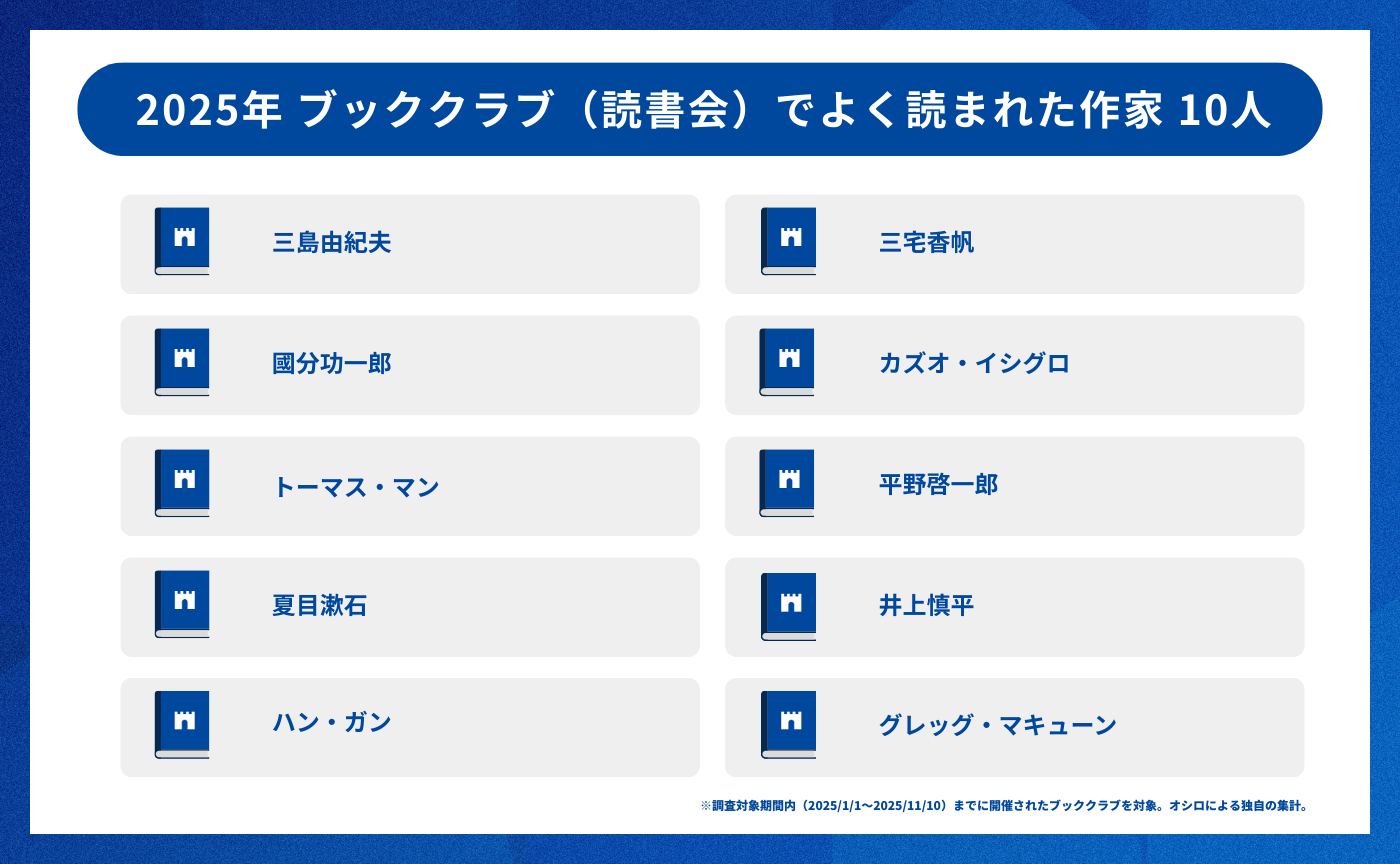 オシロ株式会社(本社:東京都渋谷区、代表取締役社長:杉山 博一)は当社が提供をするコミュニティ専用オウンドプラットフォーム「OSIRO」上で、2025年に開催されたブッククラブ(読書会)574件を対象に、多く読まれた作家を調査。