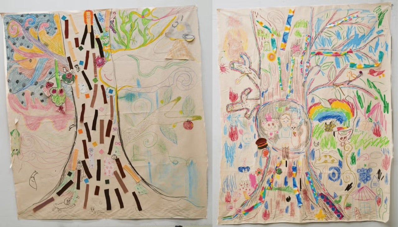 ぷくぷくさんが描いた2枚の大きな樹木の線画は、鈴木さんによって『ぷくぷくの樹』と名付けられました。線画に最初の色を入れたのは、親子でコミュニティに参加する「ぷくぷくキッズ」たち。子どもたちが自由に色を入れ、それから大人のぷくぷくさんたちも加わり、少しずつ樹木が豊かな色やモチーフで彩られていきます。