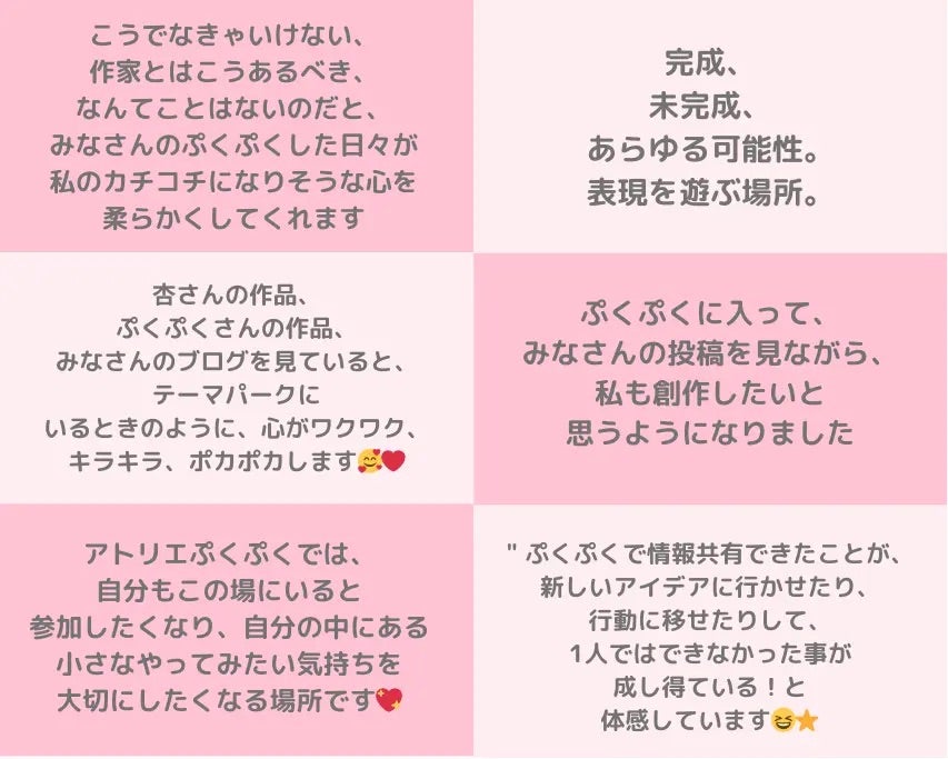 「シェアアトリエぷくぷく」は、2025年4月から毎月のテーマに沿った創作物の発表や日々の交流を重ねてきました。そのような中で、ぷくぷくさんメンバーからは「気持ちがあたたかくなる」「臆病な自分が癒される場所」「一人ではできなかったことを成し得ている」といった声が届いています。