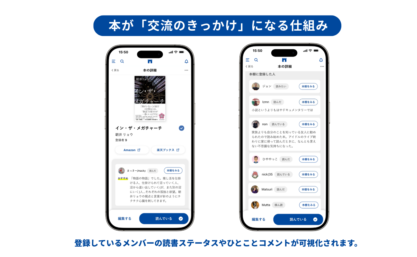 これまでは本を「登録する」というシンプルな機能のみでしたが、「なぜその本を選んだのか」「どんな感想を抱いたのか」を含めて共有をすることで、登録した人の価値観やその本に対する思い、感想、背景が伝わり、オンラインのみならず、リアルな場でも会話や交流のきっかけが自然と生まれていきます。