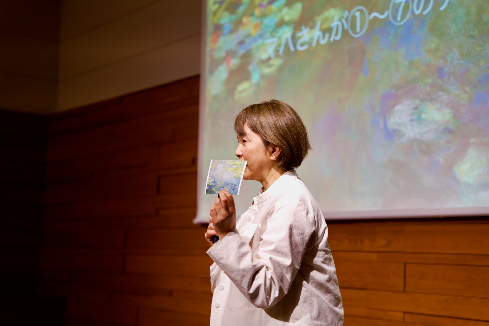 ジヴェルニーの食卓』(集英社)に登場する画家、クロード・モネが描いた『睡蓮』(1906年頃、大原美術館蔵)のポストカードが手渡されました。