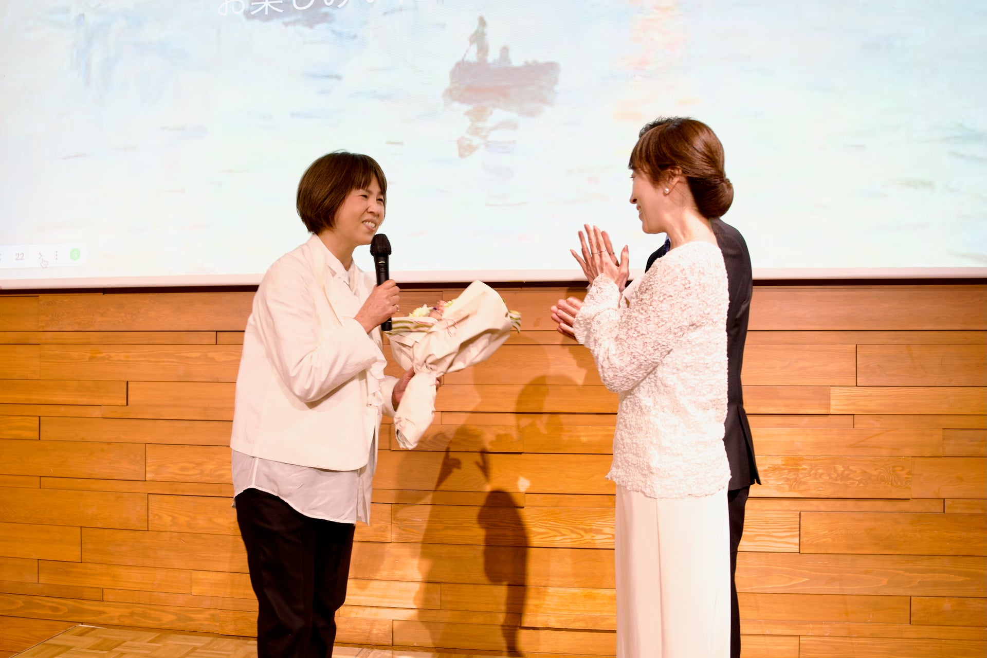 そしてスピーチの後には、マハさんの作家デビュー20周年を記念し、Sallysからのサプライズで花束が贈られました。