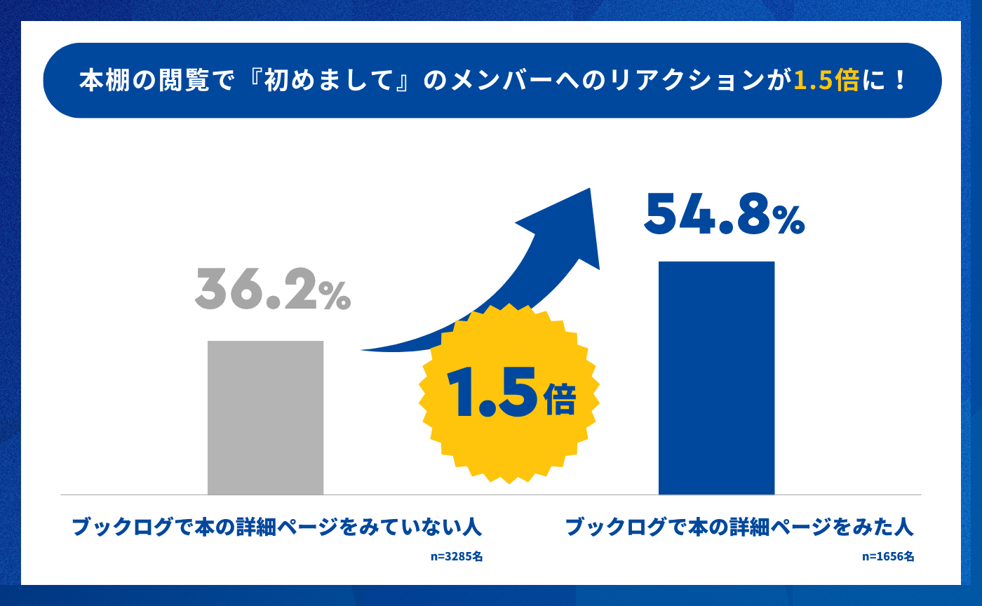 ◼︎分析結果:本棚の閲覧で「初対面」メンバーへのリアクションが1.5倍増 自社調査により、「みんなの本棚」で本の詳細ページを閲覧したユーザー(※)は、そうでないユーザーと比較して、これまで交流のなかった相手へのリアクション率が約1.5倍(36.2%→54.8%)向上することが分かりました。