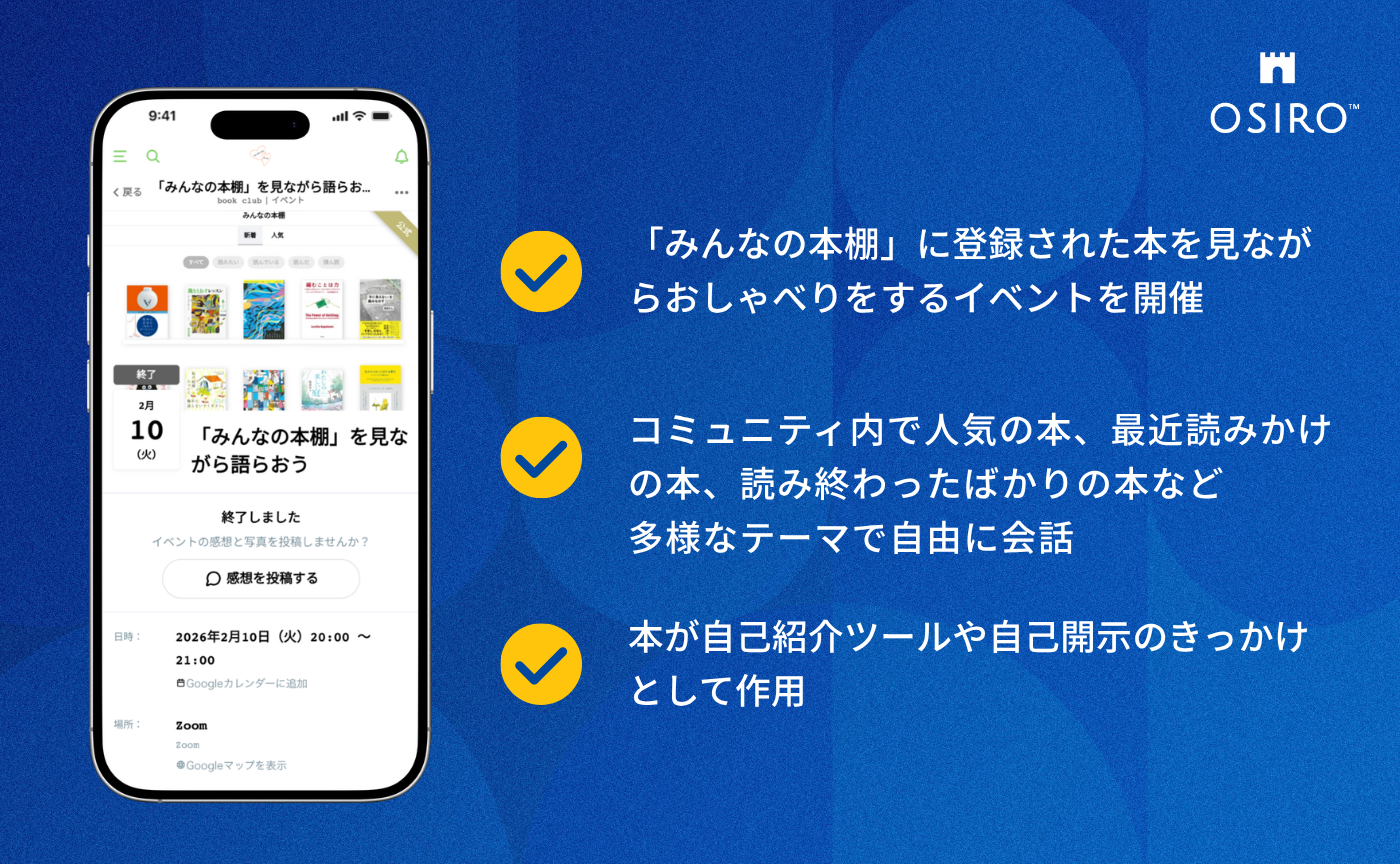 OSIROの「ブックログ」は読書記録が目的ではなく、本の登録(記録)から会話や交流のきっかけを作り、そこからブッククラブ(読書会)など本を通じた共体験を生み出し、メンバー同士のコミュニケーションを深めたいという思いが込められています。