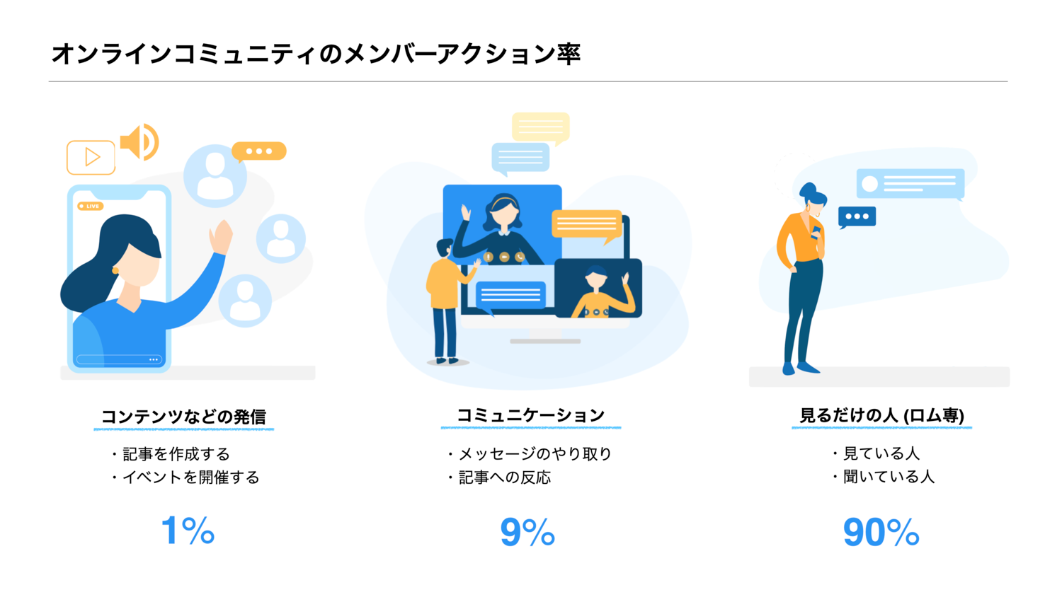 「オンラインコミュニティメンバーのアクション率」 アクション量(熱量)について前回お話しましたが、「何人でその熱量を生み出しているのか」「何%の人がコミュニティでアクションしているのか」というアクションしている人の割合 も気になりませんか? オンラインコミュニティの活動目的はさまざまでも、「メンバーと直接コミュニケーションを取りたい」「メンバー同士の横のつながりを作りたい」といった、メンバー同士の双方向のコミュニケーションを重視している人はとても多いと思います。 メンバー同士のコミュニケーションを設計していく上で、メンバーのアクション率を把握することはとても重要です 。「100人でイベントを盛り上げたい」と考えメンバーを100人集めても、アクション率が10%の場合、実際にイベントに参加してくれるのは10人程度となり、当初の目的は達成されません。 アクション率は、募集するメンバー数やコミュニティの活動内容を考えていく上でも把握しておきたい大切なポイントの一つなので、科学していきます。『1%の法則』 突然ですか、みなさん「1%の法則」 ってご存知ですか?”コミュニティメンバーのどのくらいの人がアクションし、どのくらいの人が見ているだけなのか” について発表された研究報告があり、それが「1%ルール」(Arthur, 2006)または「90-9-1の原則」(Nielsen, 2006)と呼ばれるものです。 その内容をみると、 「オンラインコミュニティにおいて1% の人がほぼ全てのコンテンツ作成を行い、9% の人が他の参加者とコミュニケーションを行う、残りの90% はただ見ているだけ」 と報告されています。 2000年代に発表されたこの「1%の法則」 、インターネットやSNSが普及した2010年代にも同様の研究結果が報告されているんです。(澁谷, 2017) イメージしやすいSNSに置き換えて考えてみましょう。 例えば、YouTubeで1%の法則をあてはめると、視聴者数10万回の場合、コメントやいいねをする人が1,000人程度になります。 有名なユーチューバーをみると、近い数字の方も多いと思います。