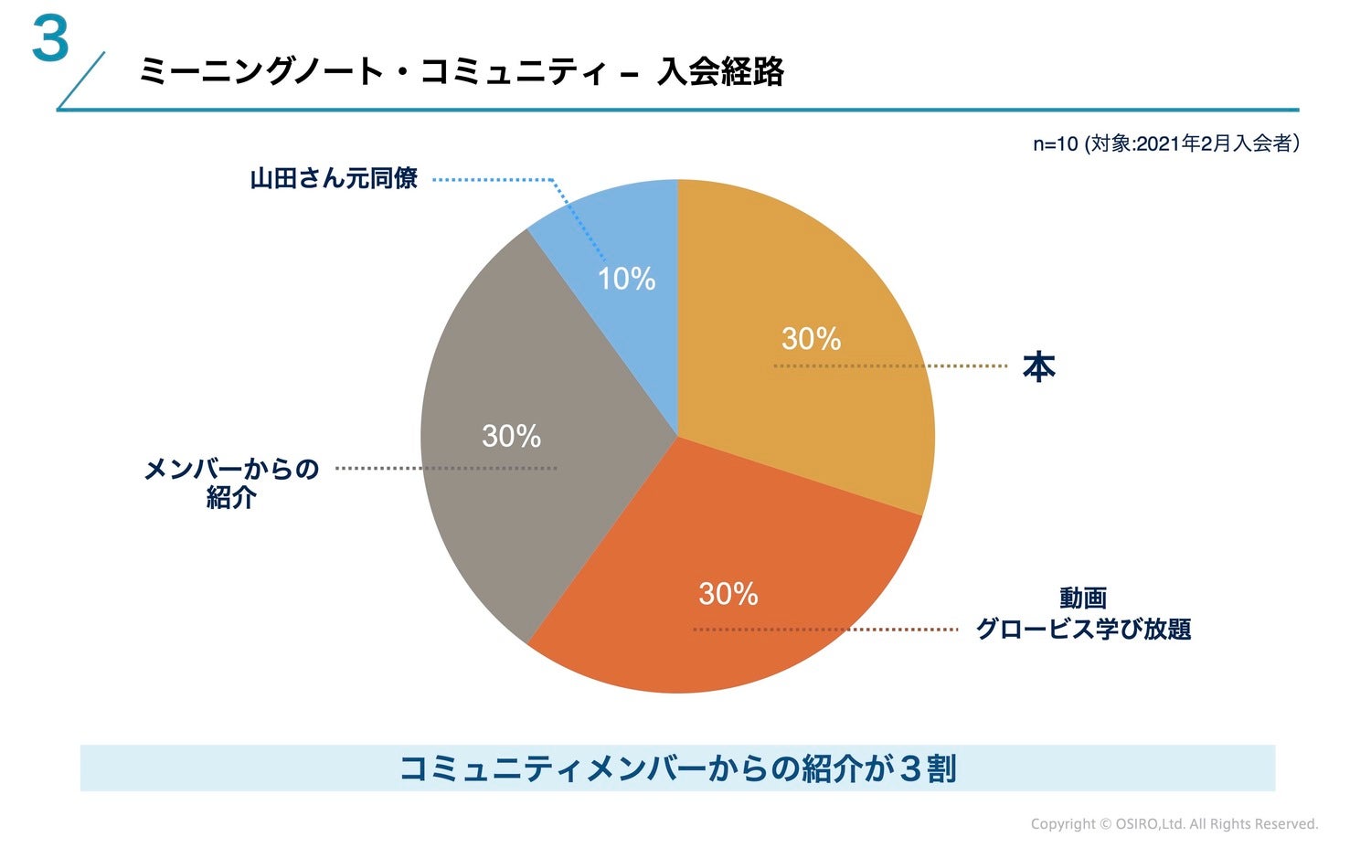 先日、今年2月にミーニングノート・コミュニティ入った10名の方に「どういう経路でコミュニティを知りましたか?」っていうインタビューをさせて頂いたんですけど、その結果が今共有させていただいている画面になります。(参照:上の図3)