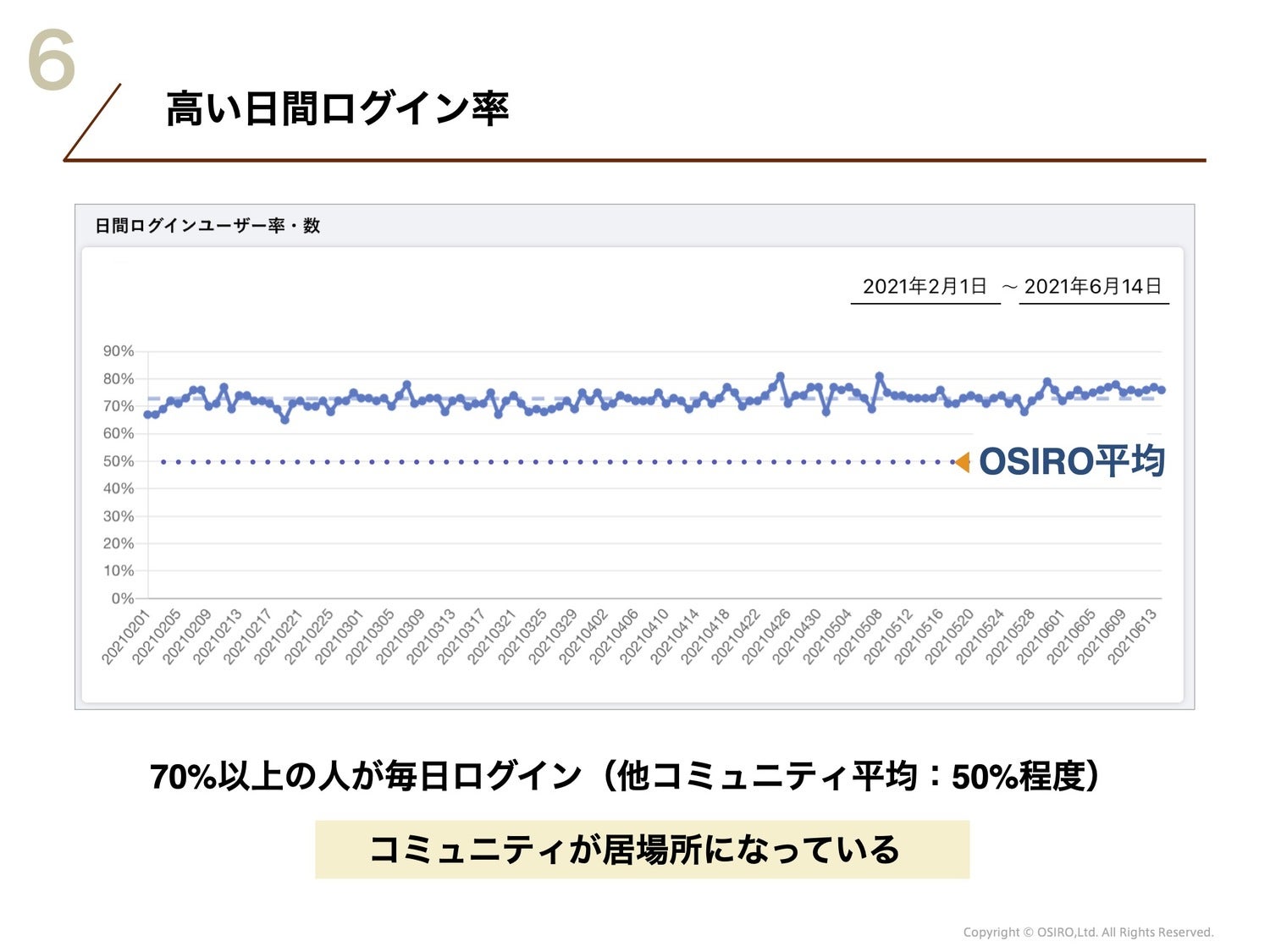 「どれくらいの方が毎日サイト(コミュニティ)に来ているのか」を見てみましょう。一般的に毎日のログイン率は平均50%、コミュニティメンバーの半分の計算になります。(参照:上の図6)