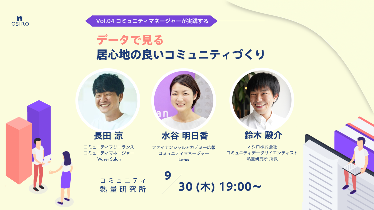 「コミュニティxデータ」でデータサイエンティスト鈴木がコミュニティのリアルな実態に迫るシリーズ『コミュニティ熱量研究所』。2ヶ月に一度、実際にOSIROを利用してコミュニティを運営される方々をゲストに迎え、実際のデータを活用しながら「コミュニティ活動分析」「効果的な運営ヒント」についてトークを展開します。